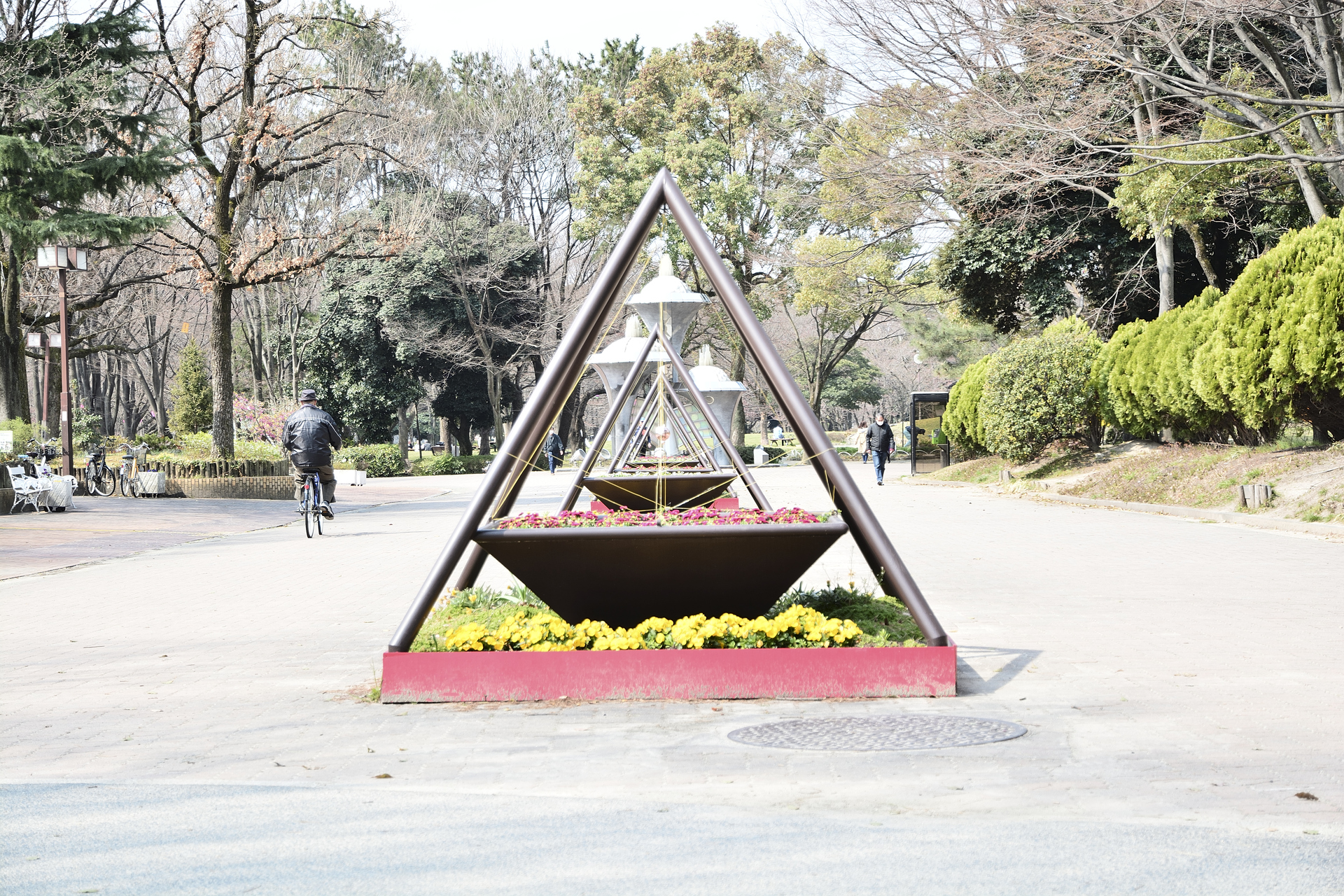 對稱一直是很迷人的題材,但卻會有令人緊繃的氣氛。照片中利用三角形中間以及兩旁的過客緩和了氣氛,也讓照片活潑不少。