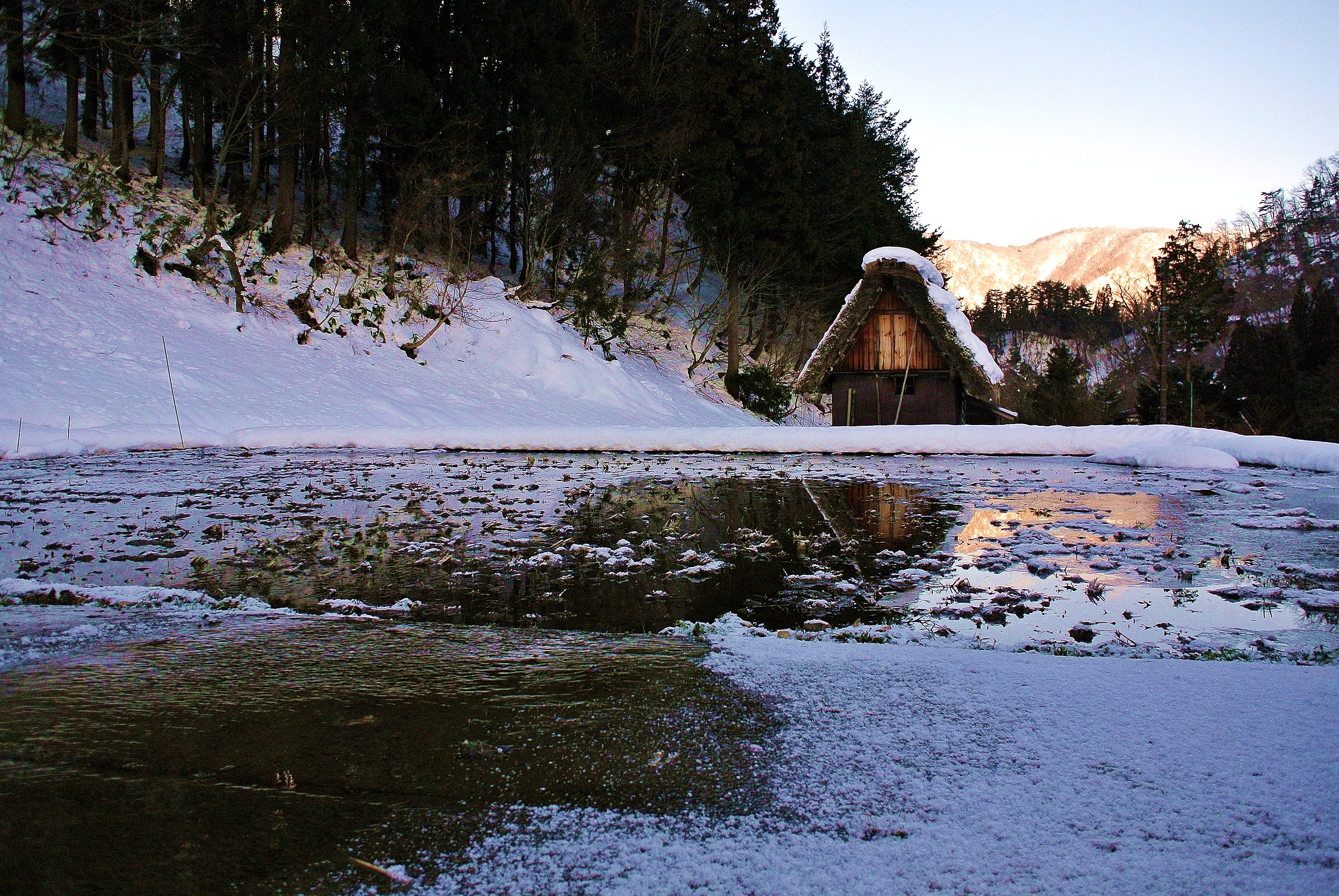 第一次出國入住日本白川鄉的世界遺產合掌村 天剛亮,太陽映在灌溉的水田上 加上茅草蓋的百年老屋讓人覺得自己跑進了日本的童話故事裡面